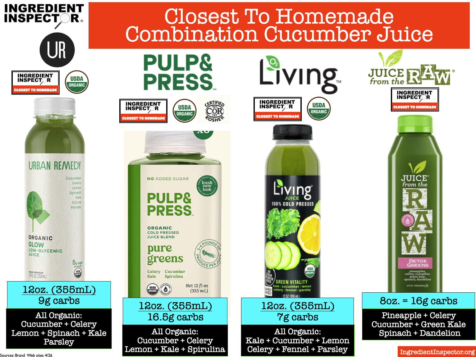 CUCUMBER JUICES CLOSEST TO HOMEMADE: Following are several options of Closest To Homemade Combination Cucumber Juices including Suja Organic, Columbia Gorge Organic, Pressed Juicery, Urban Remedy Organic, Pulp & Press Organic, Living Juice Organic, Juice From The Raw, Olivia Organics and RAW Juicery. (Sources: Brand Web sites 4/26)
