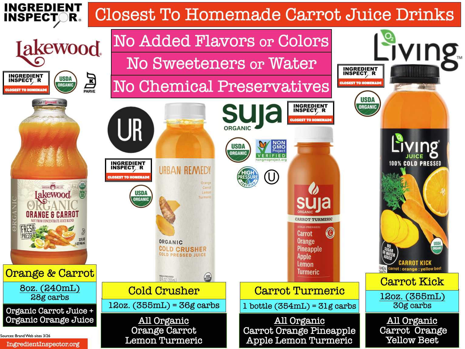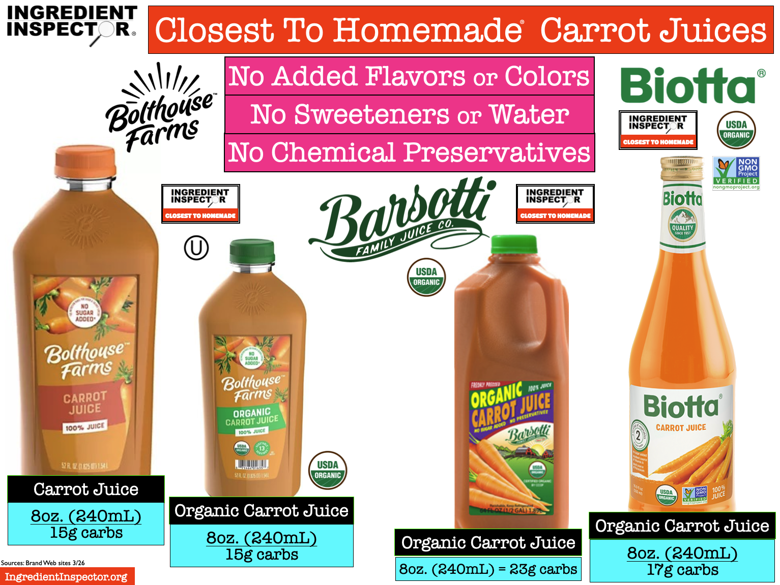 CARROT JUICES CLOSEST TO HOMEMADE: Following are Carrot Juices which are Closest To Homemade with no added Flavors, Colors, Sweeteners, Water or Chemical Preservatives. These include Lakewood Organic, Pomona Organic Juices, R.W. Knudsen Organic, Columbia Gorge Organic, Bolthouse Farms, Barsotti Family Juice Co. Organic, and Biotta Organic. (Sources: Brand Web sites 3/26)