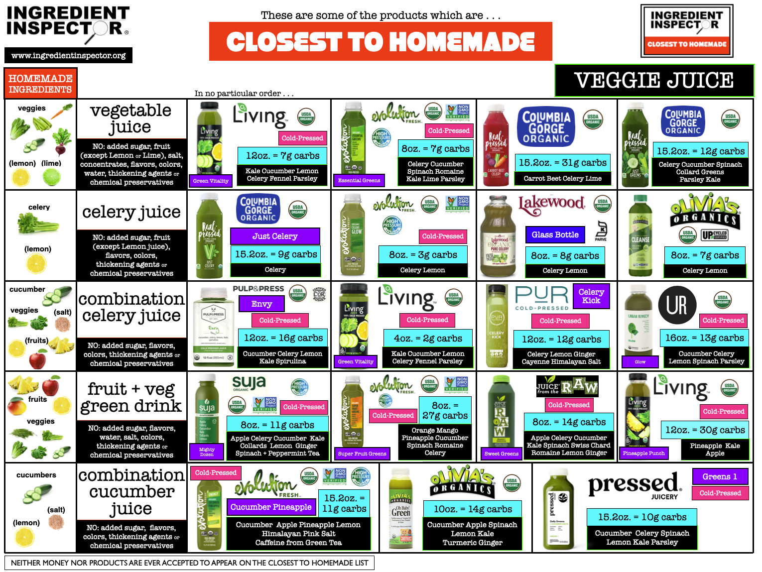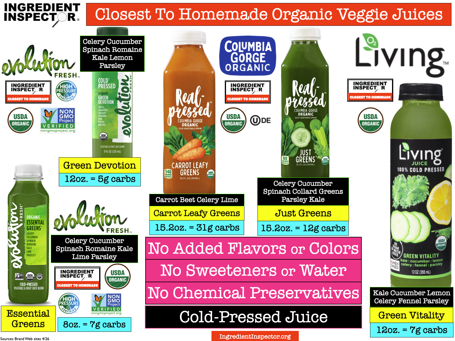 VEGGIE JUICES CLOSEST TO HOMEMADE: The Closest To Homemade Veggie Juices shown below have no ingredients Not In Kitchen when making homemade Juice >> no Added Flavors, Colors, Sweeteners, Water or Chemical Preservatives. They are all made from Cold-Pressed Juice.