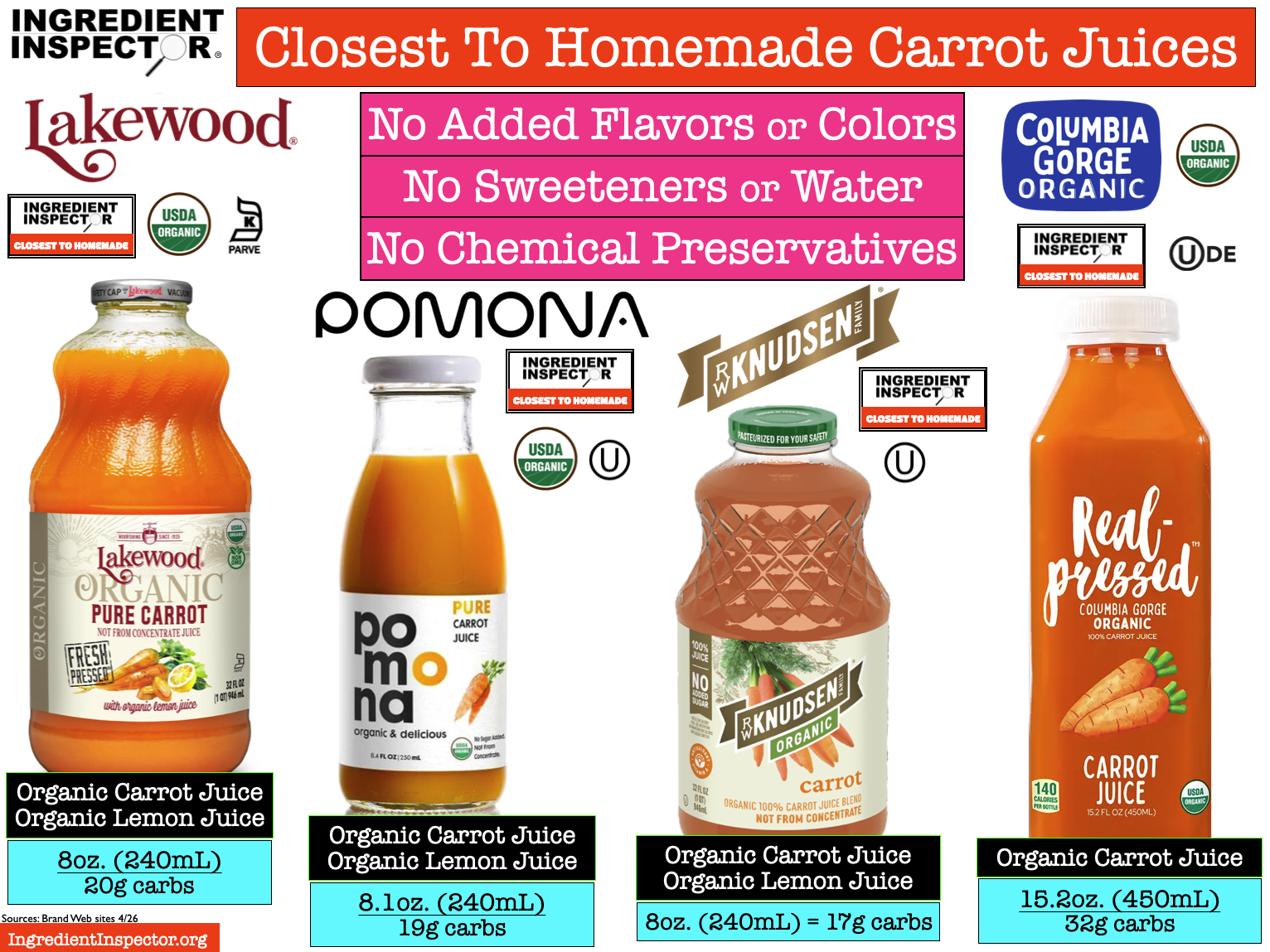CARROT JUICES CLOSEST TO HOMEMADE: Following are Carrot Juices which are Closest To Homemade with no added Flavors, Colors, Sweeteners, Water or Chemical Preservatives. These include Lakewood Organic, Pomona Organic Juices, R.W. Knudsen Organic, Columbia Gorge Organic, Bolthouse Farms, Barsotti Family Juice Co. Organic, and Biotta Organic. (Sources: Brand Web sites 4/26)