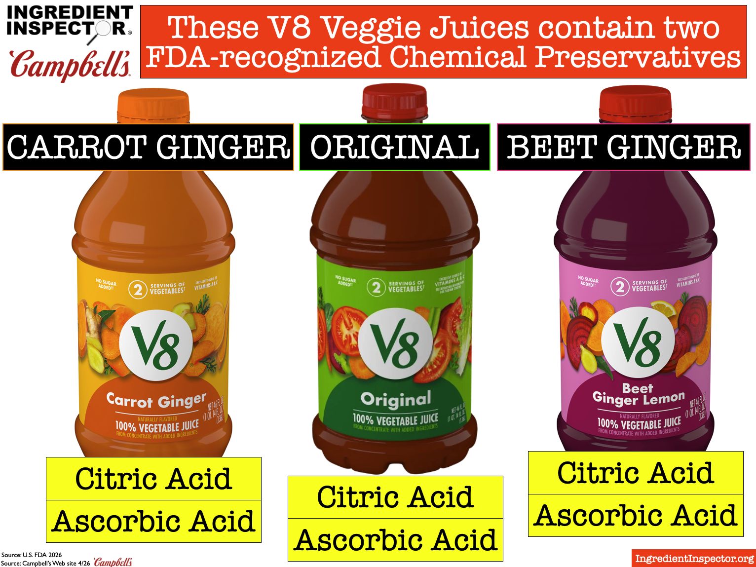 Seen below, these V8 Veggie Juices contain two FDA-recognized Chemical Preservatives. (Source: U.S. FDA 2026)