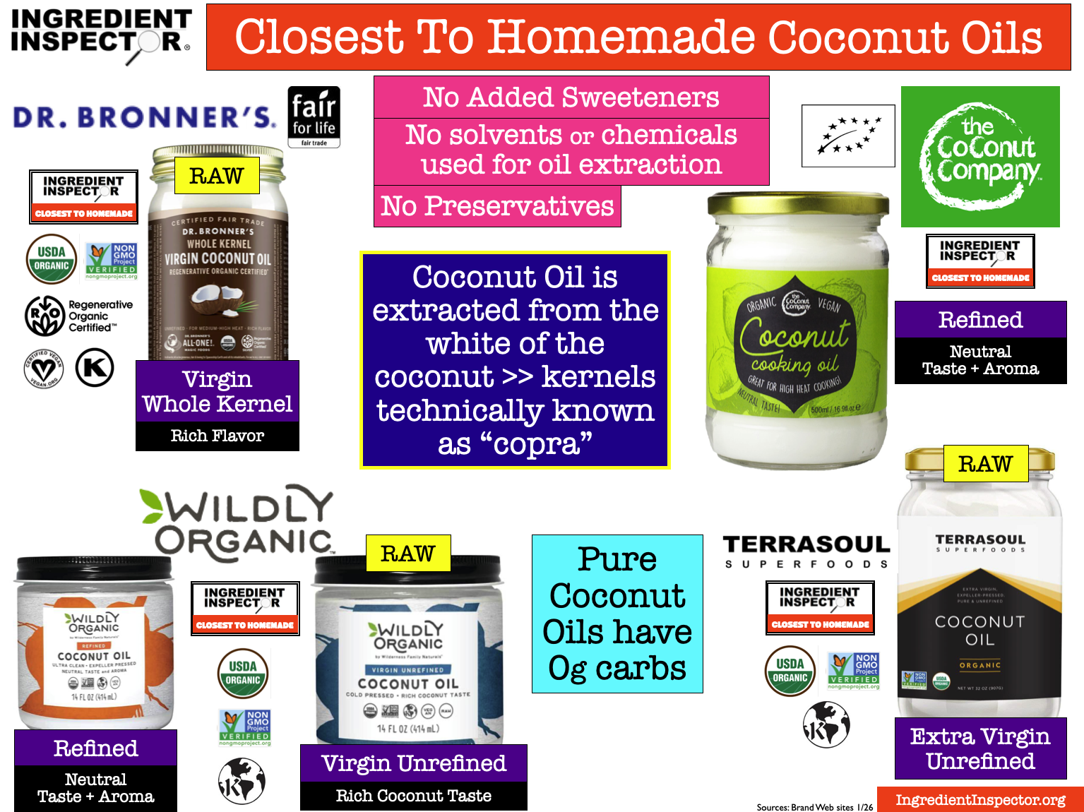 Seen below, the Closest To Homemade brands do not use solvents or chemicals for oil extraction and have no additional additives. These include Non-GMO Project Verified Dr. Bronner’s which is Regenerative Organic Certified with Virgin Whole Kernel; UK-based The Coconut Company Organic; Wildly Organic Non-GMO Project Verified Refined and Virgin Unrefined, and Terrasoul Superfoods Non-GMO Project Verified and Organic Extra Virgin Unrefined Coconut Oil. (Sources: Brand Web sites 1/26)