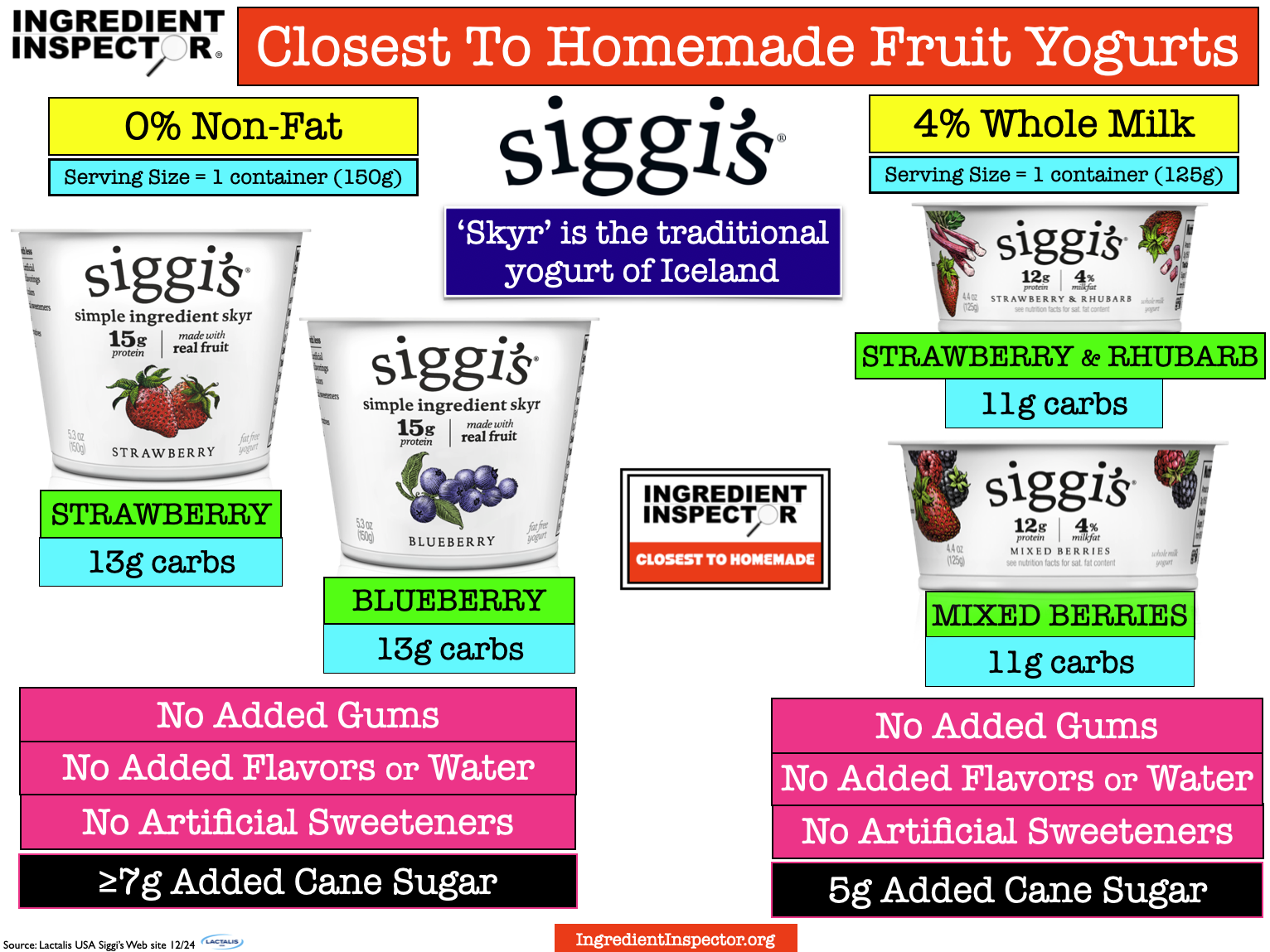Shown below, CLOSEST TO HOMEMADE FRUIT YOGURTS: Siggi’s 0% Non-Fat fruit yogurts with no Added Flavors and no Added Water, are made with Cane Sugar, Fruit Pectin and contain 7 grams or less of added Cane Sugar.