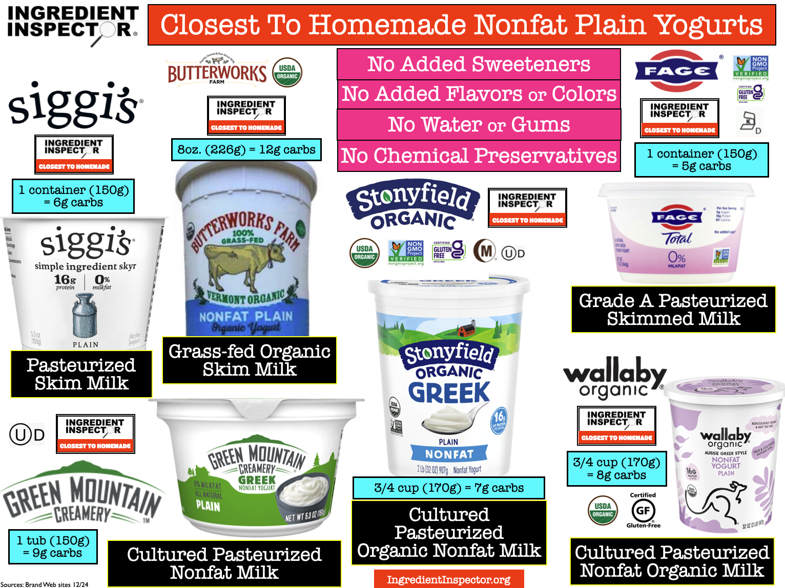CLOSEST TO HOMEMADE PLAIN YOGURTS Whole Milk and Nonfat: The Closest To Homemade Plain Yogurts shown below have no added Sweeteners, Flavors, Colors, Water, Gums or Chemical Preservatives. (Sources: Brand Web sites 12/24)