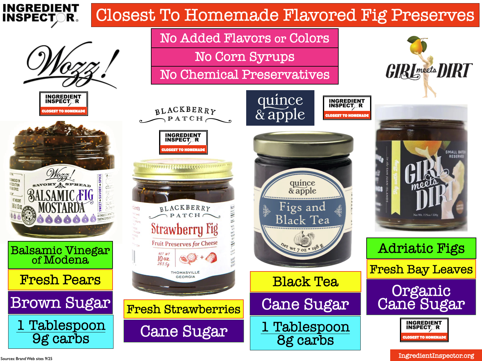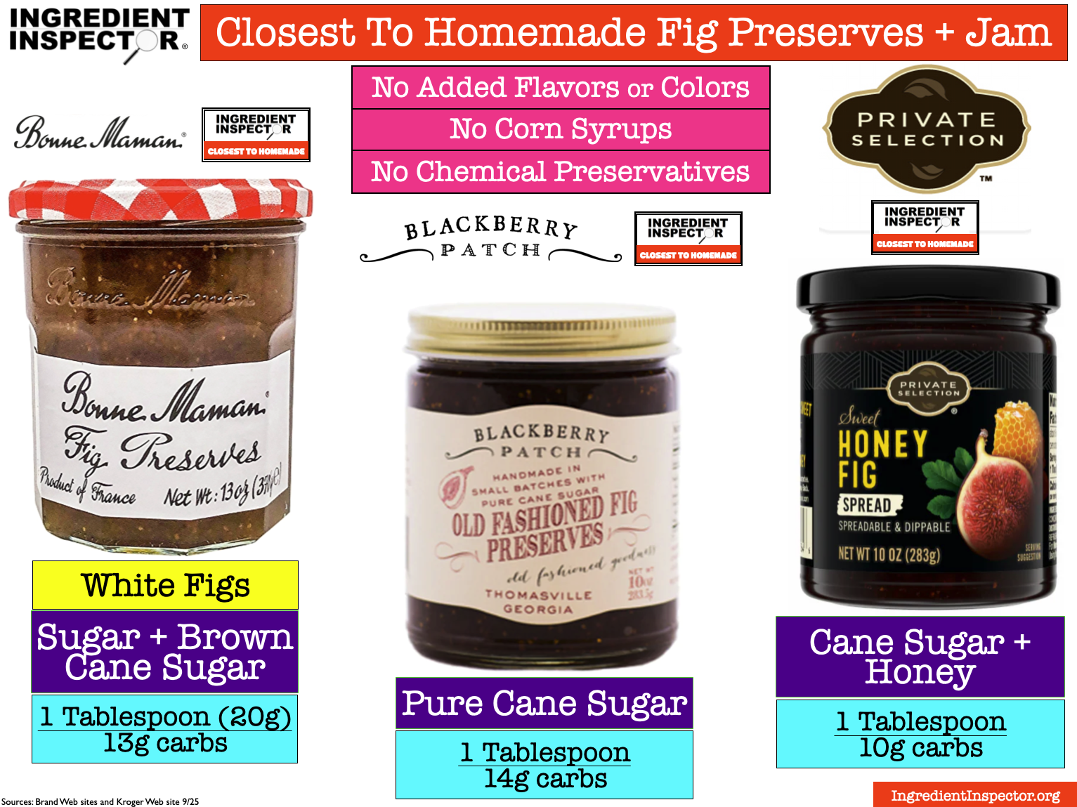CLOSEST TO HOMEMADE: Following are several Fig Preserves, Jams, Spreads and Conserves which are Closest To Homemade with no added Flavors, Colors, Corn Syrups, Chemical Preservatives or Artificial Sweeteners plus a selection which also has no Added Sugar. (Sources: Brand Web sites 9/25)