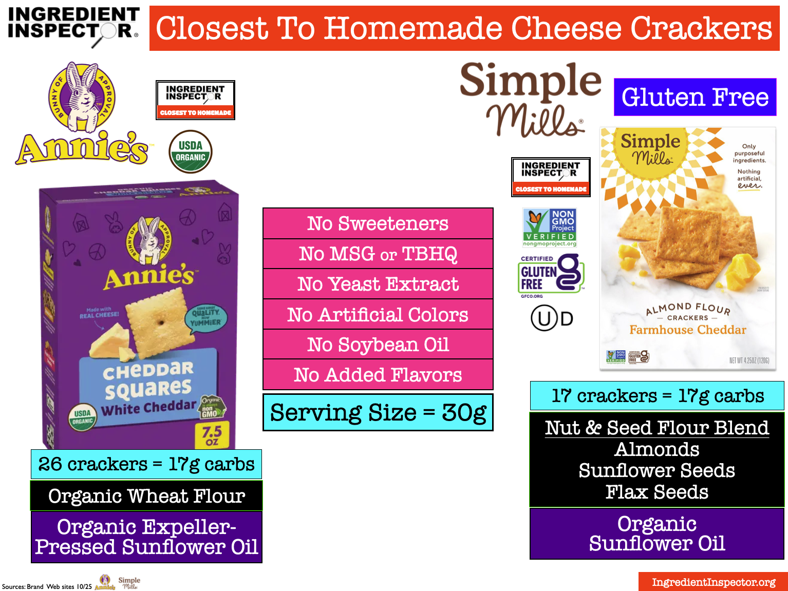 CLOSEST TO HOMEMADE CHEESE CRACKERS: Here are two Cheese Crackers which are Closest To Homemade with No Sweeteners, MSG, TBHQ, Yeast Extract, Artificial Colors, Soybean Oil or Added Flavors. (Sources: Brand Web sites 10/25)