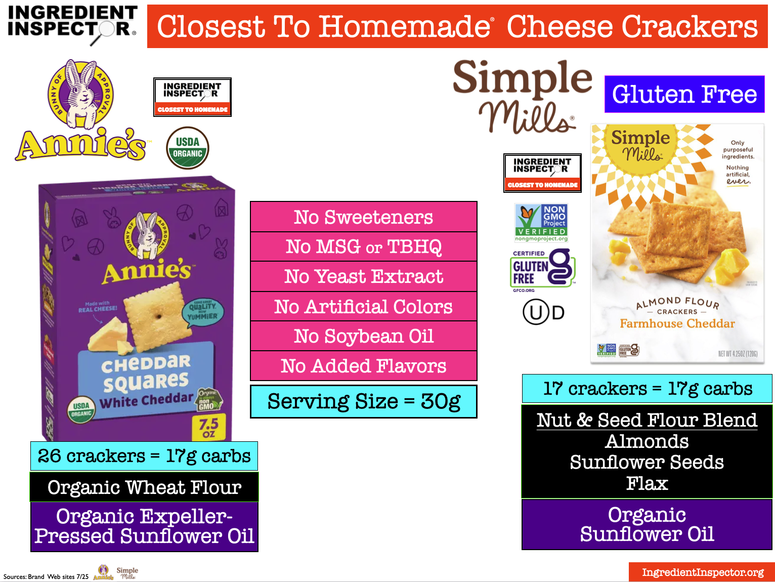 CLOSEST TO HOMEMADE CHEESE CRACKERS: Here are two Cheese Crackers which are Closest To Homemade with No Sweeteners, MSG, TBHQ, Yeast Extract, Artificial Colors, Soybean Oil or Added Flavors. (Sources: Brand Web sites 7/25)