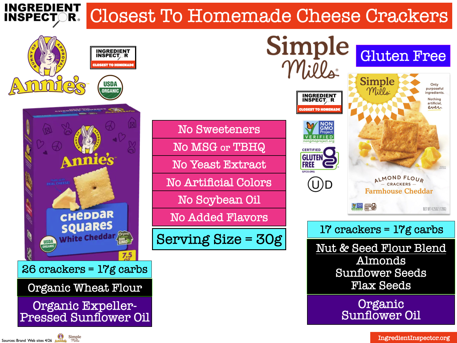 CLOSEST TO HOMEMADE CHEESE CRACKERS: Here are two Cheese Crackers which are Closest To Homemade with No Sweeteners, MSG, TBHQ, Yeast Extract, Artificial Colors, Soybean Oil or Added Flavors. (Sources: Brand Web sites 4/26)
