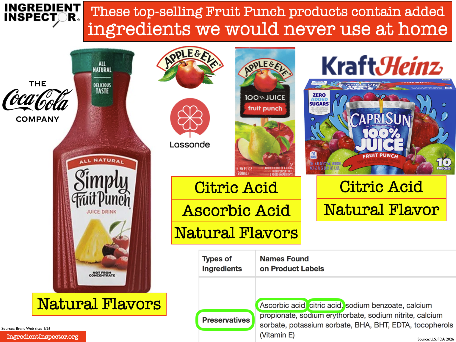 Seen below, these top-selling Fruit Punch drinks in the U.S. all contain ingredients we would never use at home: Simply, Apple & Eve and Capri Sun. (Sources: Brand Web sites 1/26; U.S. FDA 2026)