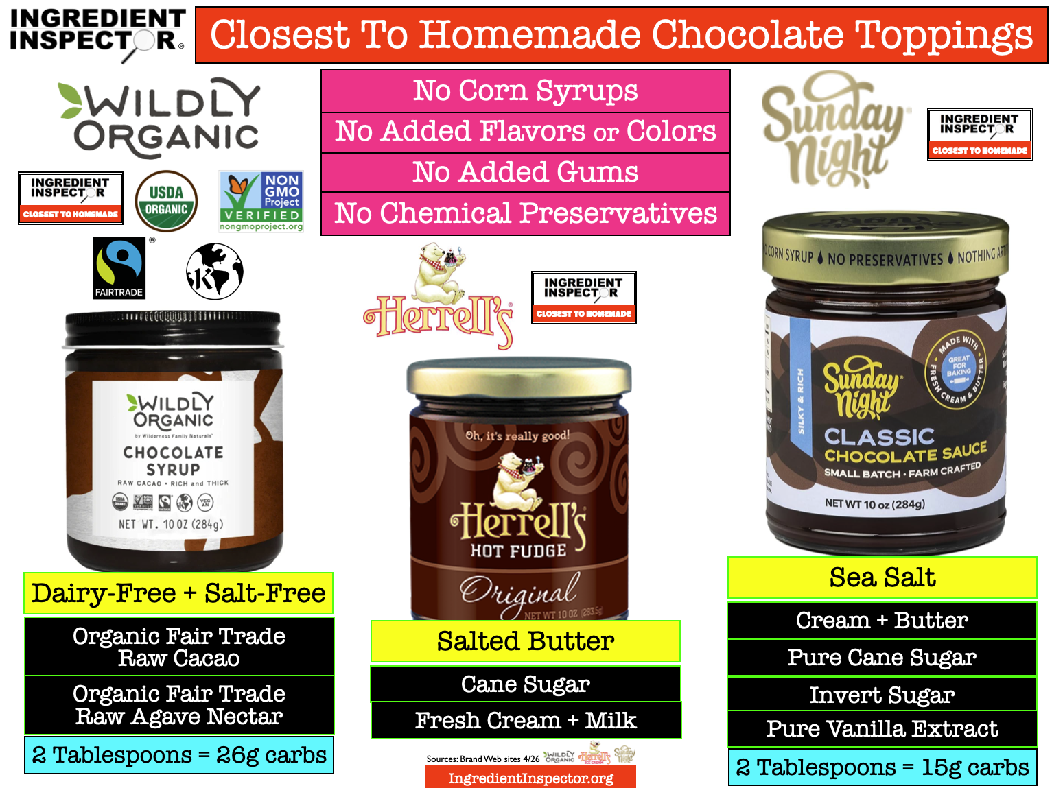 CLOSEST TO HOMEMADE CHOCOLATE SYRUP AND SAUCES: These products below have no Corn Syrups, no Added Flavors, Colors or Gums, and no Chemical Preservatives. Sunday Night Dark and Classic Chocolate Sauces made with Cream + Butter; Joe’s Syrup Organic Dark Chocolate Sauce; Fran’s Organic Dark Chocolate Sauce which is Certified Fairtrade with Organic Cream, Organic Fair Trade Dutch Cocoa and Organic Fair Trade Cane Sugar; Wildly Organic Chocolate Syrup which is Certified Fair Trade and Non-GMO Project Verified >> it contains only two ingredients: Organic Fair Trade Raw Cacao + Organic Fair Trade Agave Nectar, and Herrell’s Hot Fudge made with Cane Sugar, Butter, Cocoa and alcohol-free Chocolate Liquor. (Sources: Brand Web sites 4/26)