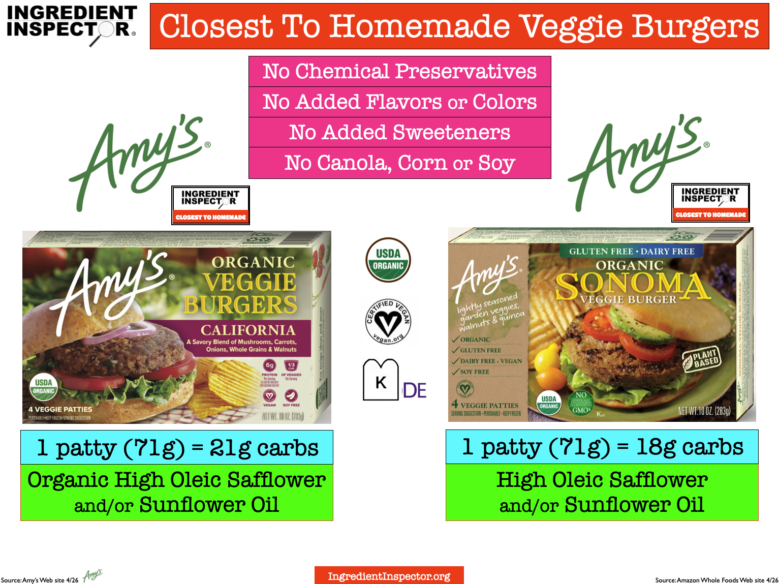 Here are a couple of Veggie Burgers from Amy’s with ingredients which are Closest To Homemade: