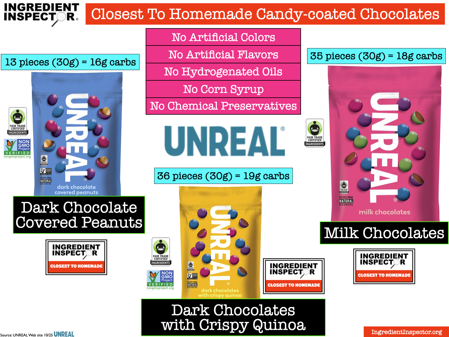 UNREAL contains no Artificial Colors or Added Flavors, no Corn Syrup, no Palm or Soy, and no Chemical Preservatives. UNREAL Dark Chocolate Covered Peanuts’ ingredients are Fair Trade Certified and Non-GMO Project Verified. (Source: UNREAL Web site 10/25)
