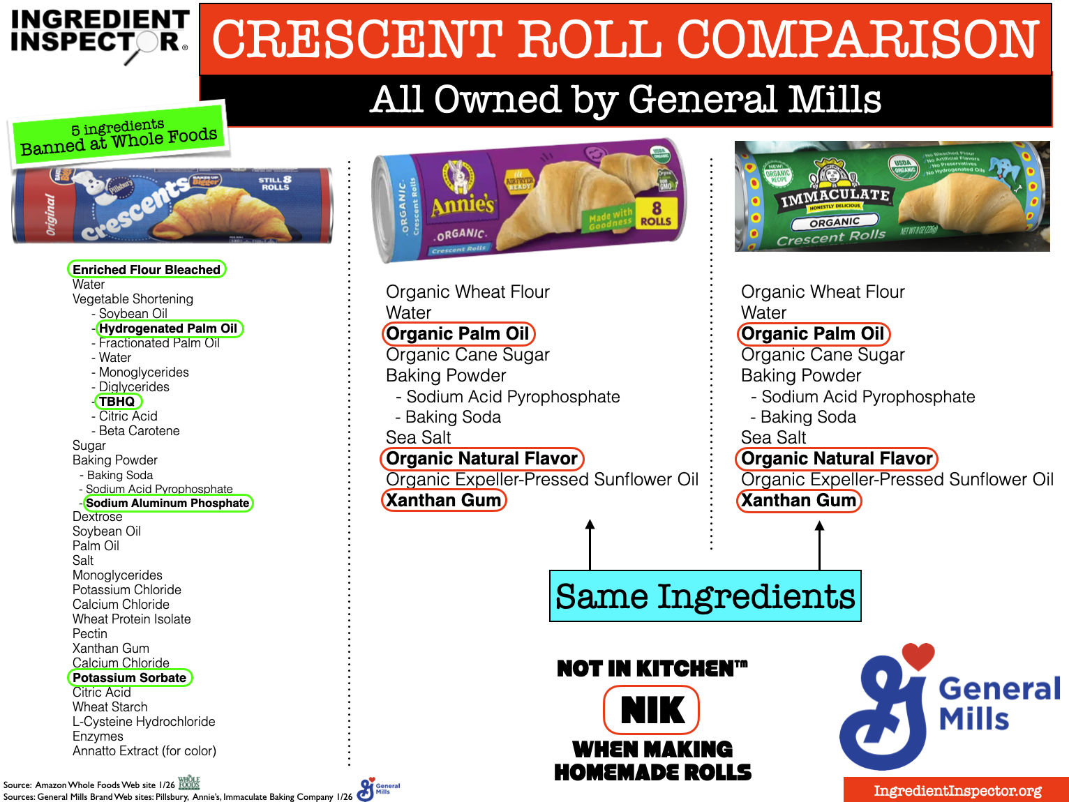 TODAY, PILLSBURY CRESCENTS CONTAIN FIVE INGREDIENTS WHICH ARE BANNED AT WHOLE FOODS: Whole Foods cites certain ingredients as “Unacceptable in food” and Pillsbury Crescents contain five of them including Bleached Flour, Hydrogenated Palm Oil, Sodium Aluminum Phosphate and Tert-Butylhydroquinone (listed as TBHQ) (Source for Pillsbury ingredients: General Mills Pillsbury Web site 1/26; Source for banned ingredients: Amazon Whole Foods Web site 1/26)