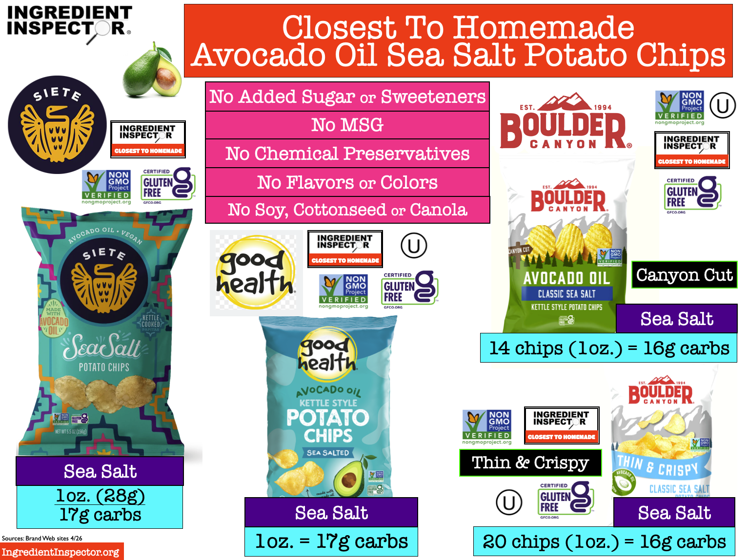 CLOSEST TO HOMEMADE POTATO CHIPS: Here are some Potato Chips which are Closest To Homemade with no added Sugar, Sweeteners, MSG, Chemical Preservatives, Soybean Oil, Cottonseed Oil, Canola Oil, Flavors or Colors. (Sources: Brand Web sites 4/26)