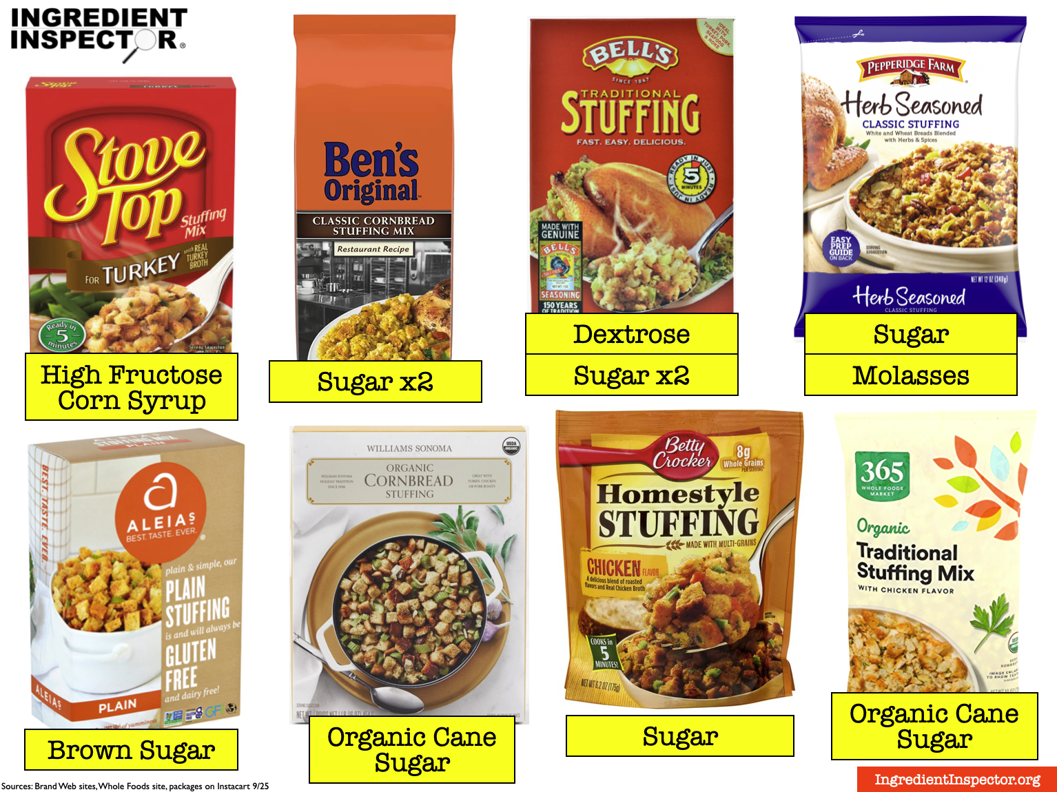 ADDED SWEETENERS: Shown below, many commercial Stuffing Mixes include added sweeteners in different forms. (Sources: Brand Web sites, Whole Foods Web site, packages on Instacart 9/25)