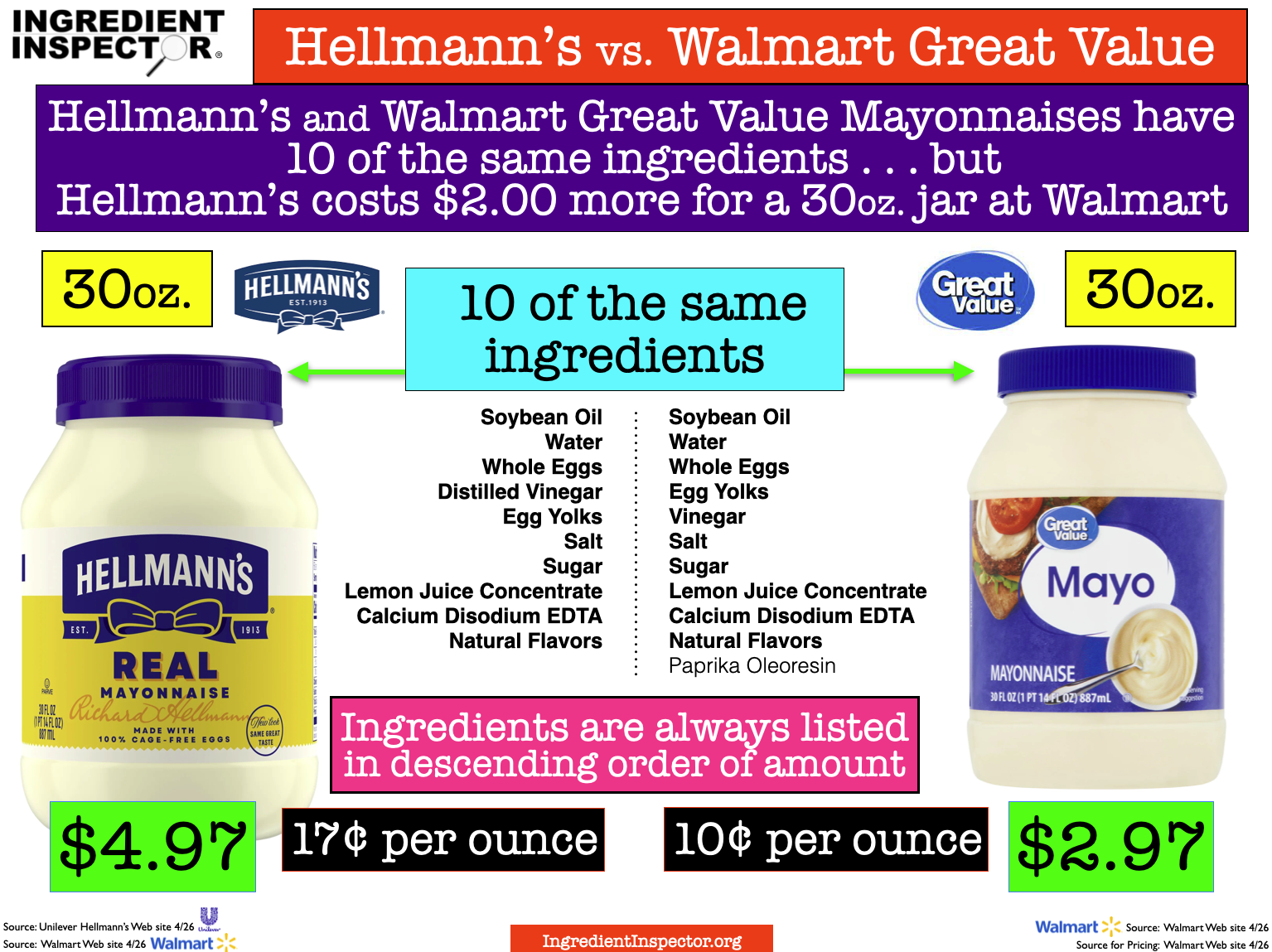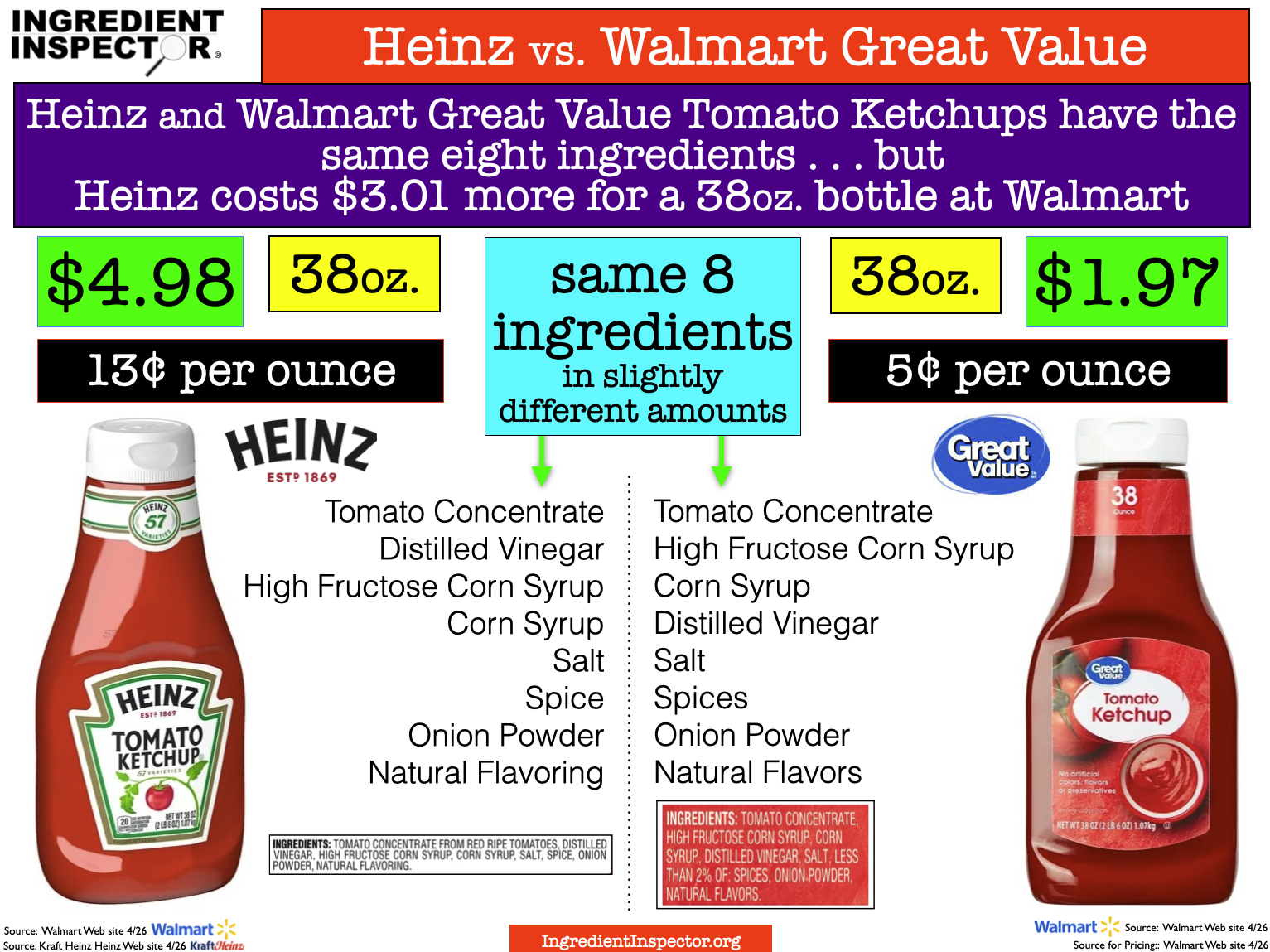 You may know that private label brands for grocery stores and stores such as Walmart and Target are manufactured by various food companies. As such, many private label products contain ingredients which are similar to the #1 U.S. products. Following are comparisons of a trio of #1 Brands vs. Walmart Great Value: