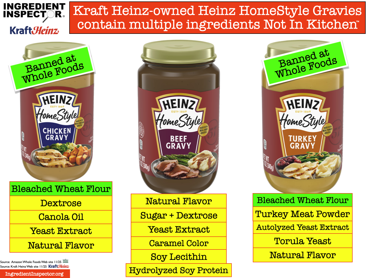 Seen below, KRAFT HEINZ’S GRAVIES ARE NOT Closest To Homemade: Here’s what’s inside three of the different Gravies from Kraft Heinz which are all banned at Whole Foods. (Source for ingredients: Kraft Heinz Web site 11/25)