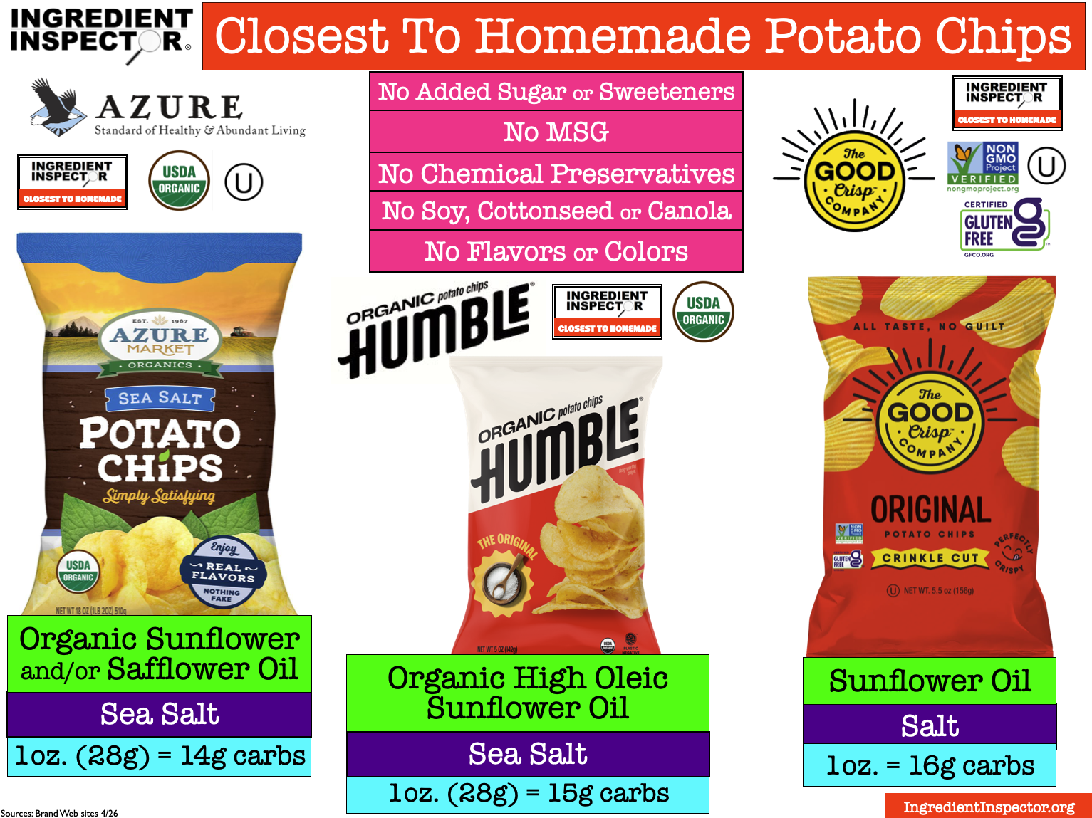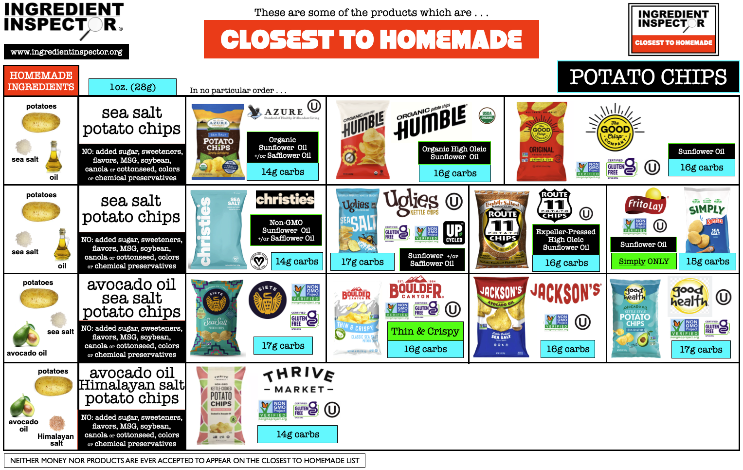 Closest To Homemade POTATO CHIPS: Following are some Plain Potato Chips with Sea Salt or Pink Himalayan Salt which are certified as Closest To Homemade with no added Sugar or Sweeteners, MSG, Chemical Preservatives, Soybean Oil, Cottonseed Oil, Canola Oil, Flavors or Colors. (Sources: Brand Web sites 4/26)