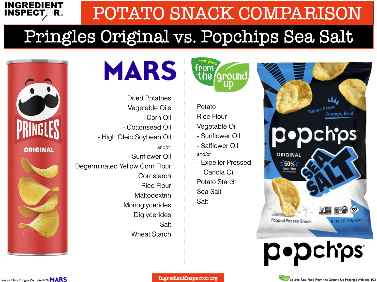 Below is a comparison of Pringles Original vs. Popchips Sea Salt. (Source: Popchips Web site 4/26)