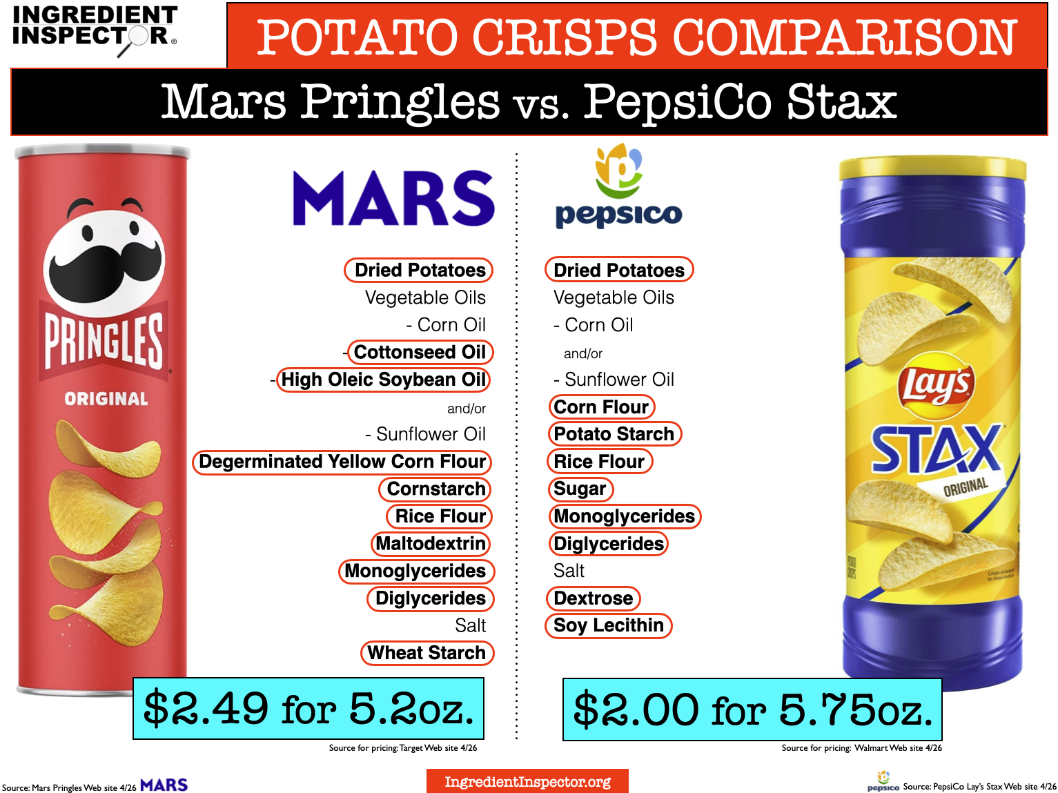 POTATO CRISPS COMPARISON >> PRINGLES vs. PEPSICO STAX. (Source for Frito-Lay Stax ingredients: PepsiCo Stax Web site 4/26 and package on Target Web site 4/26; Sources for pricing: Target and Walmart Web sites 4/26)