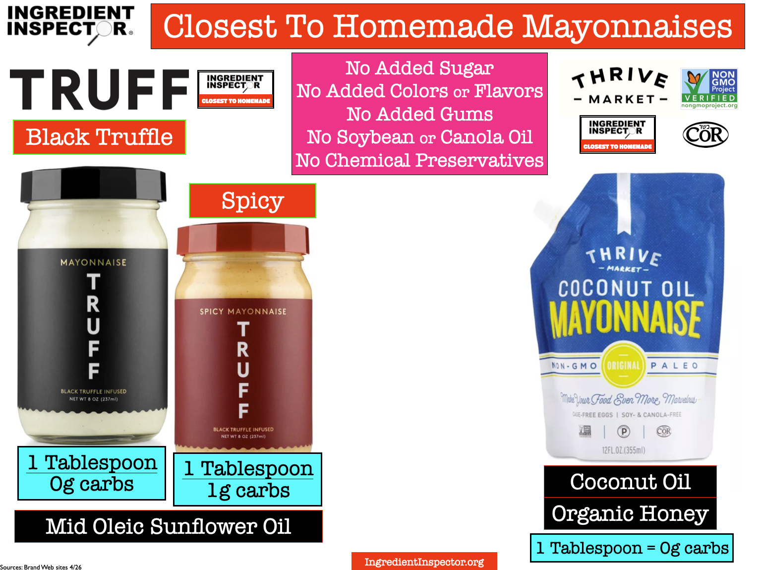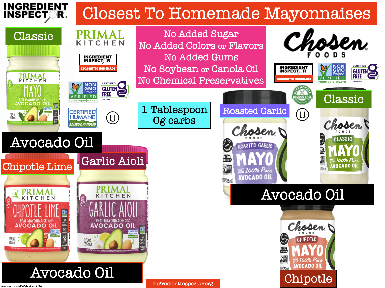 CLOSEST TO HOMEMADE: The Mayonnaises certified as Closest To Homemade have no added Sweeteners (except one with added Organic Honey), Colors, Flavors, Gums, Soybean Oil, Canola Oil or Chemical Preservatives. They are made with one or more of the following: Avocado Oil, Coconut Oil or Sunflower Oil. (Sources for ingredients: Brand Web sites 4/26)
