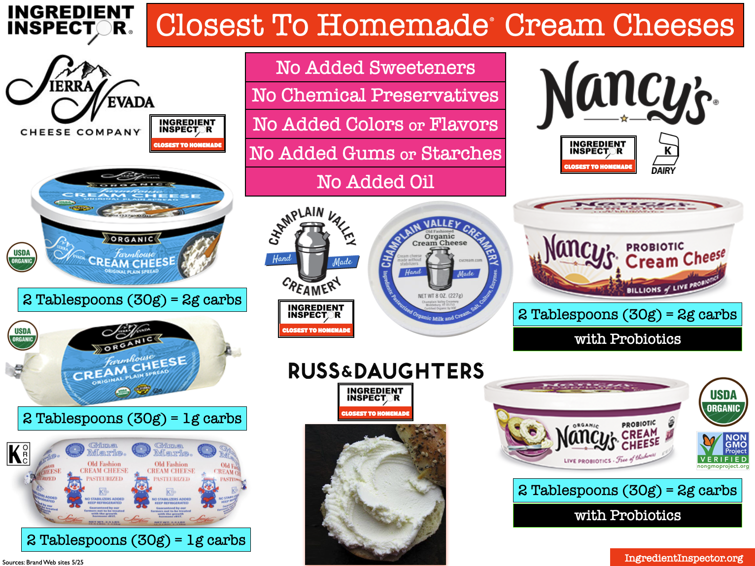 CLOSEST TO HOMEMADE: Following are some Cream Cheeses made with only the type of ingredients we would use at home. These include offerings from the Sierra Nevada Cheese Company, Champlain Valley Creamery based in Vermont, Russ & Daughters based in Manhattan, and Nancy’s with added Probiotic Cultures.
