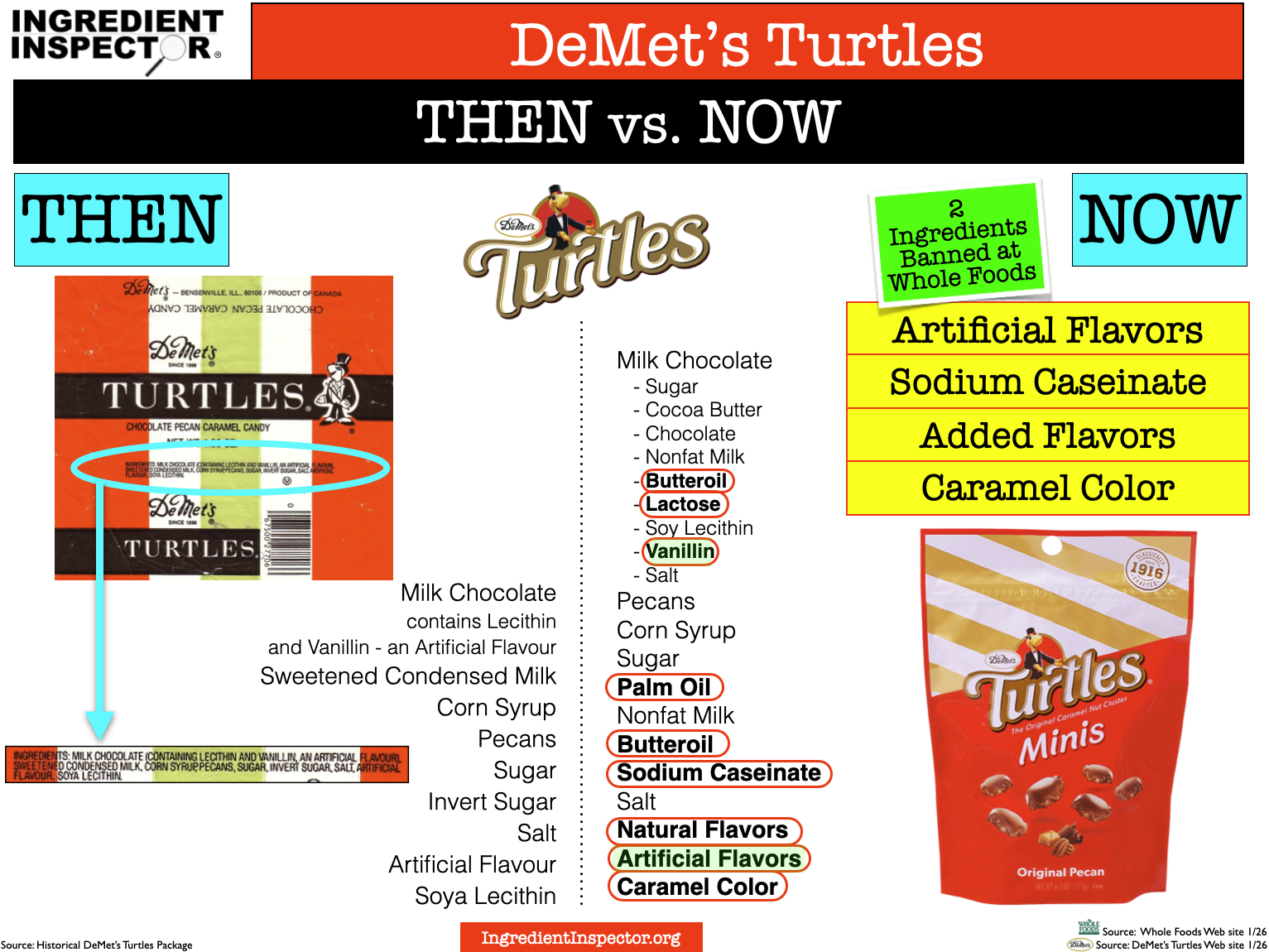 DeMet’s Turtles are banned at Whole Foods for Vanillin and additional Artificial Flavors.