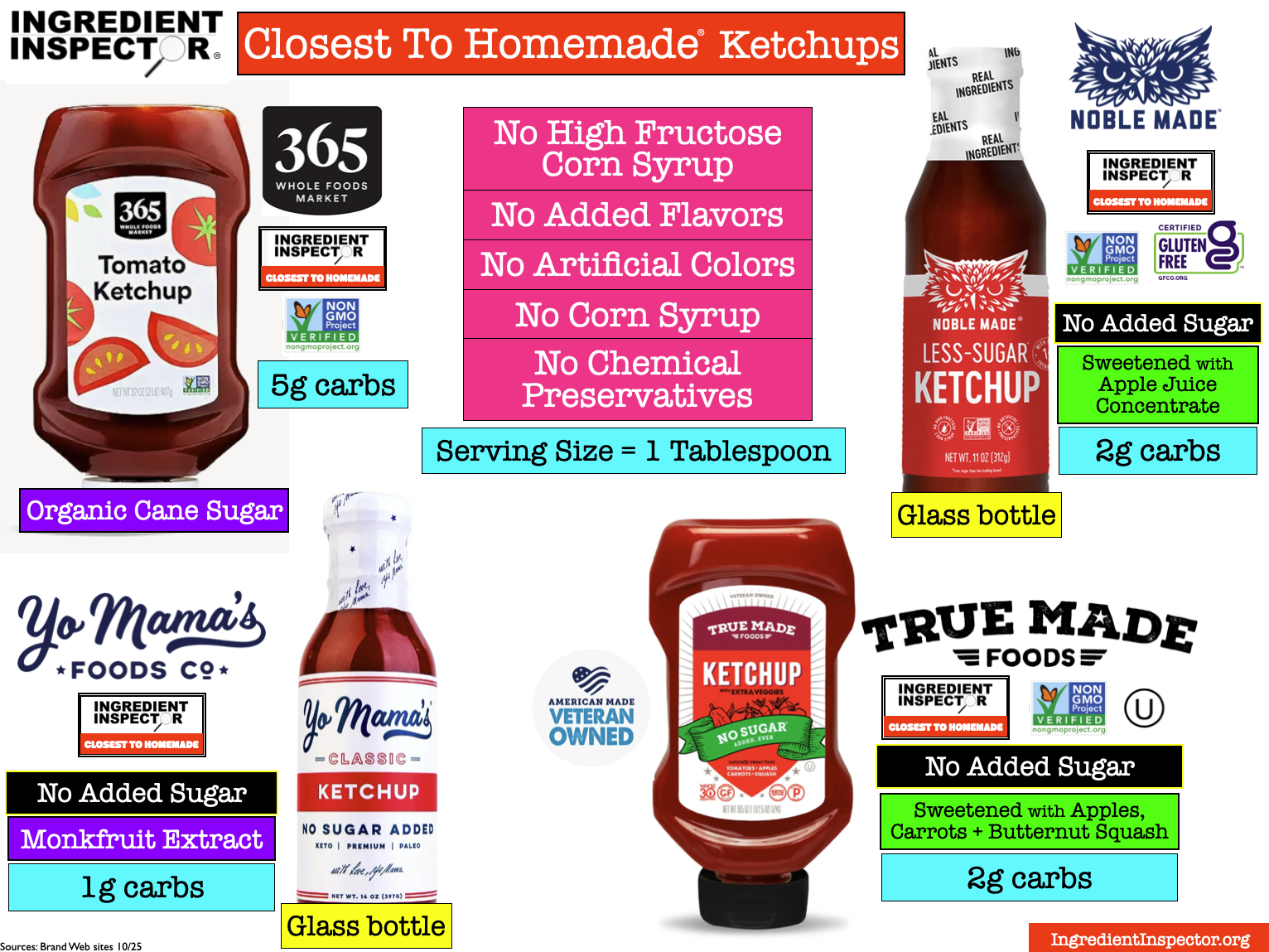 CLOSEST TO HOMEMADE: The Closest To Homemade Ketchup brands you see on the charts below have no ingredients Not In Kitchen >> they have no High Fructose Corn Syrup, Flavors, Colors, Corn Syrup or Chemical Preservatives. (Sources for ingredients: Brand Web sites 10/25)