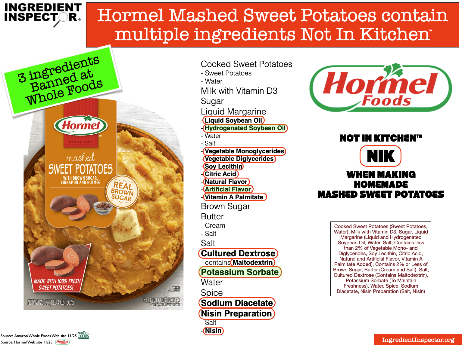 Hormel Mashed Sweet Potatoes contain multiple ingredients Not In Kitchen™ when making homemade Mashed Sweet Potatoes including Hydrogenated Soybean Oil, Citric Acid, Artificial Flavor and Potassium Sorbate, among others.