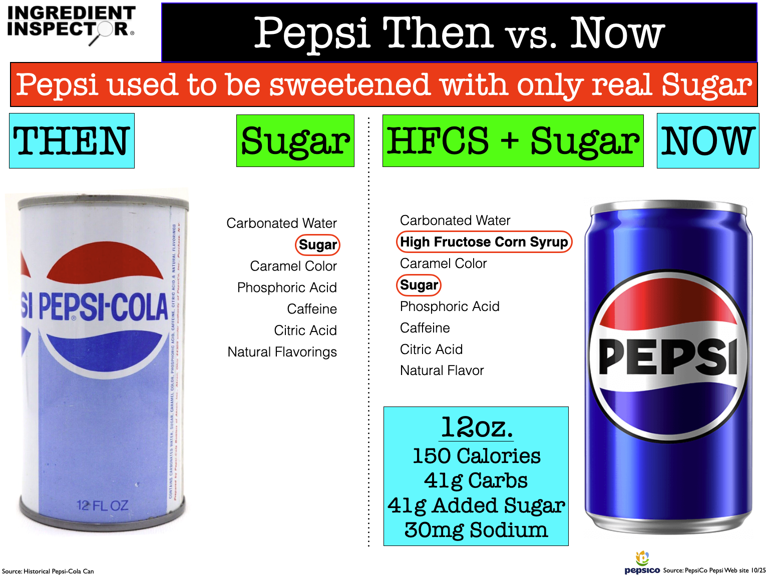 Pepsi was once sweetened with only Sugar and now it contains High Fructose Corn Syrup as the second ingredient. Ingredients are always listed in descending order of amount.
